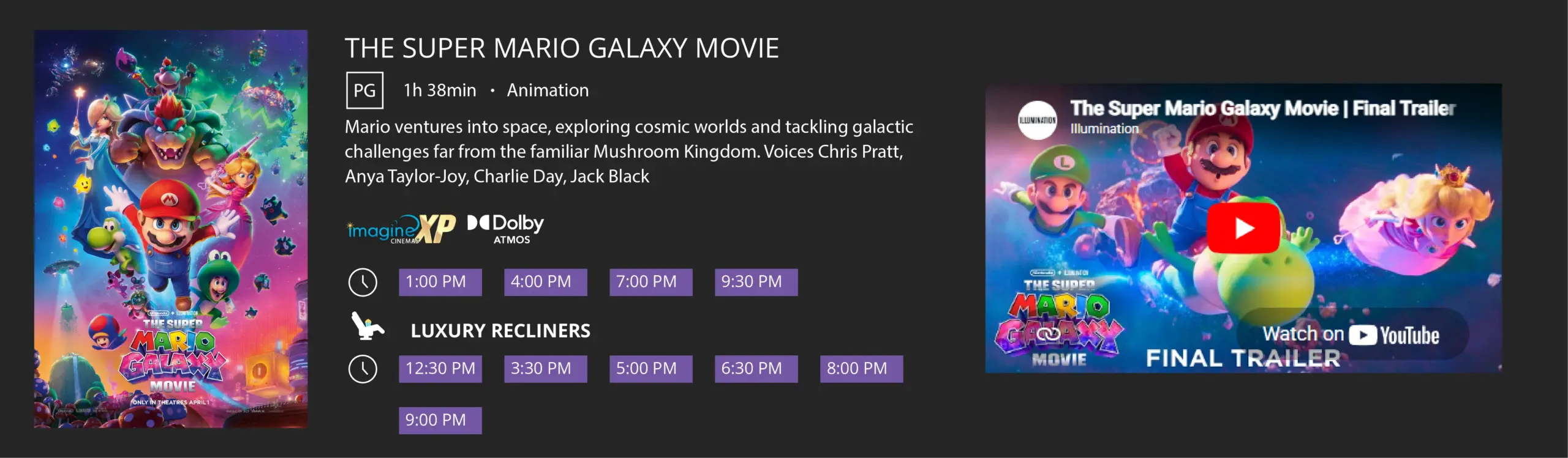 Relax in premium reclining seats built for comfort from the moment you sit down. Stretch out, adjust your position, and enjoy the movie with plenty of space and support. Whether you are here for a quick visit or a full feature, you will stay comfortable the entire time.